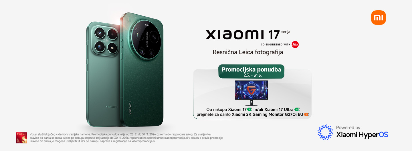 Ob nakupu telefona Xiaomi 17 ali Xiaomi 17 Ultra te čaka odlično darilo: Xiaomi 2K gaming monitor G27Qi. Promocija traja od 2. 3. 2026 do 31. 3. 2026 ali do razprodaje zalog.