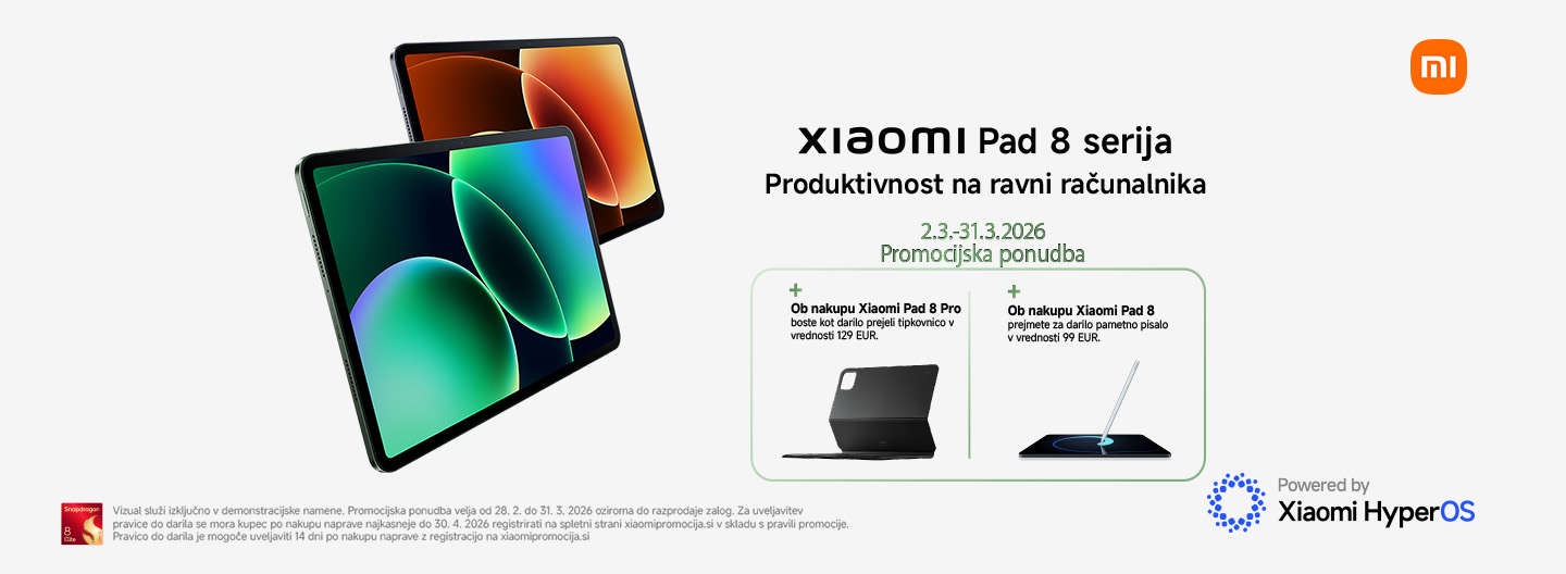 Ob nakupu tablic serije Xiaomi Pad 8 te čaka odlično darilo: pri nakupu Xiaomi Pad 8 Pro: tipkovnica v vrednosti 129 € in ob nakupu Xiaomi Pad 8 pametno pisalo v vrednosti 99 €. Promocija traja od 2. 3. 2026 do 31. 3. 2026 ali do razprodaje zalog. Kako do darila.