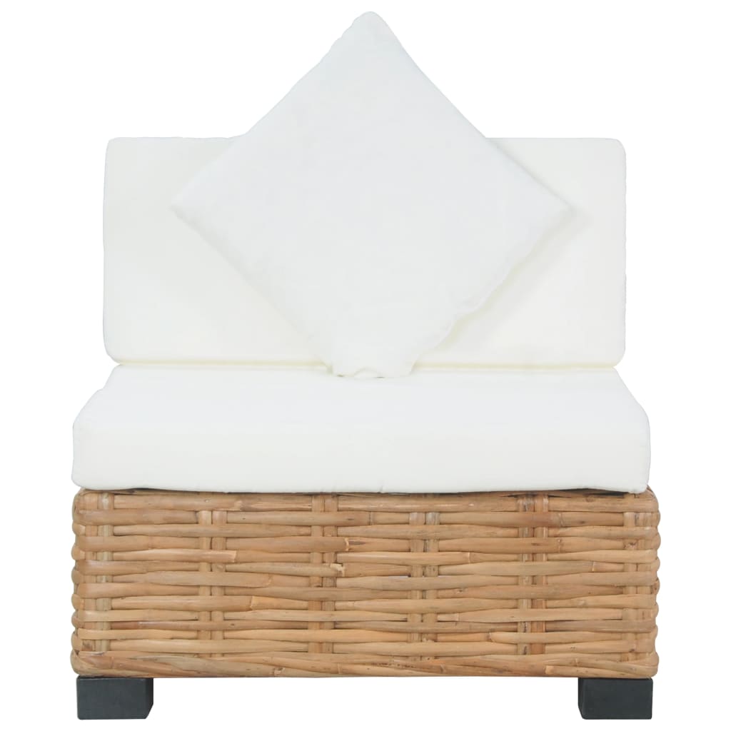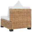 Okvir je obdan z obstojnim naravnim ratanom z atraktivnim naravnim videzom in dekorativnimi tkanimi vzorci. Noge kavča so izdelane iz mahagonija in mangovega lesa, ki zagotavlja močno oporo in visoko stabilnost. Blazine nudijo udobje in dober občutek. Kavč brez naslonjal za roke je preprost za sestavo. Paket vsebuje 1 kavč brez naslonjal, 1 blazino za sedež, 1 blazino za hrbet in 1 vzglavnik.