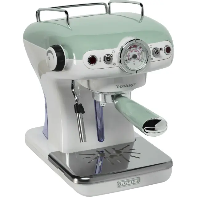 Ariete 1389 Vintage espresso kavni aparat združuje klasičen vintage dizajn z zmogljivostjo 850 W in 15 bar pritiska, ki zagotavlja bogato in kremasto kavo. Ima odstranljiv rezervoar za vodo s kapaciteto 0,9 L ter vgrajen penilnik mleka. Združljiv je z mletimi kavami in kapsulami. Izdelan je iz kovine in plastike, dimenzije so 23 x 28 x 31 cm, teža 5,02 kg. Napajanje je 220-240 V, opremljen je z odstranljivo posodo za kapljanje in vidnim indikatorjem nivoja vode. Vključuje funkcijo varčevanja z energijo v stanju pripravljenosti. Barve so zelena in bež, kar doda eleganten pridih v kuhinjo.
