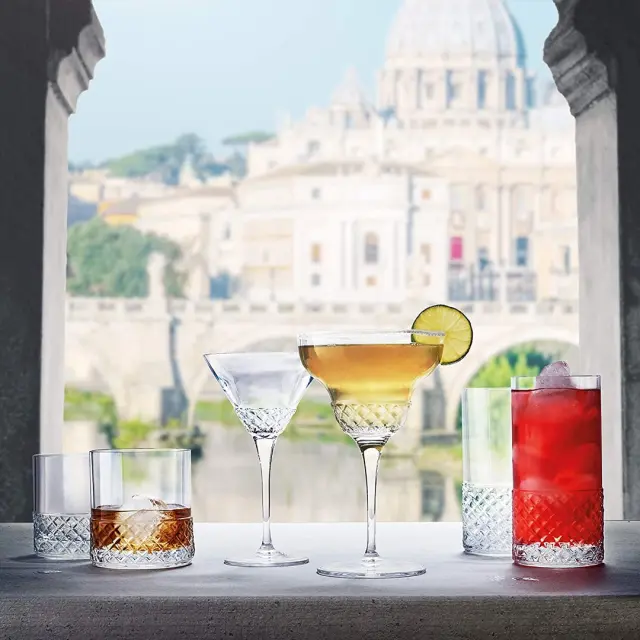 Moderni in elegantni 6-delni set kelihov blagovne znamke Luigi Bormioli iz popolnoma prosojnega in sijočega stekla vaši postrežbi koktajlov vnaša pridih razkošja. Linija ROMA 1960 z edinstvenim vzorcem rezanega stekla navdušuje z italijanskim vintage stilom, glamurjem in prefinjenostjo. Kelihi so narejeni iz ultra čistega stekla izdelanega s pomočjo patentirane tehnologije SON.hyx. Steklo ima odlično prosojnost in sijaj, v kombinaciji z dodatno odpornostjo (pecelj dodatno ojačan s titanom) na mehanske udarce in zmožnostjo, da prenese industrijske cikle pranja.