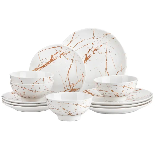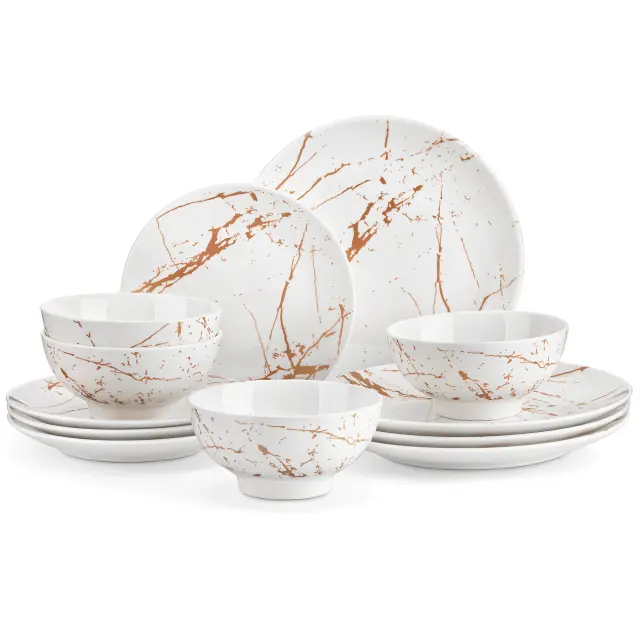 • Popoln jedilni set: Ta 12-delni set vključuje jedilne krožnike, krožnike za sladice in sklede, kar vam zagotavlja vse, kar potrebujete za popolno jedilno izkušnjo.