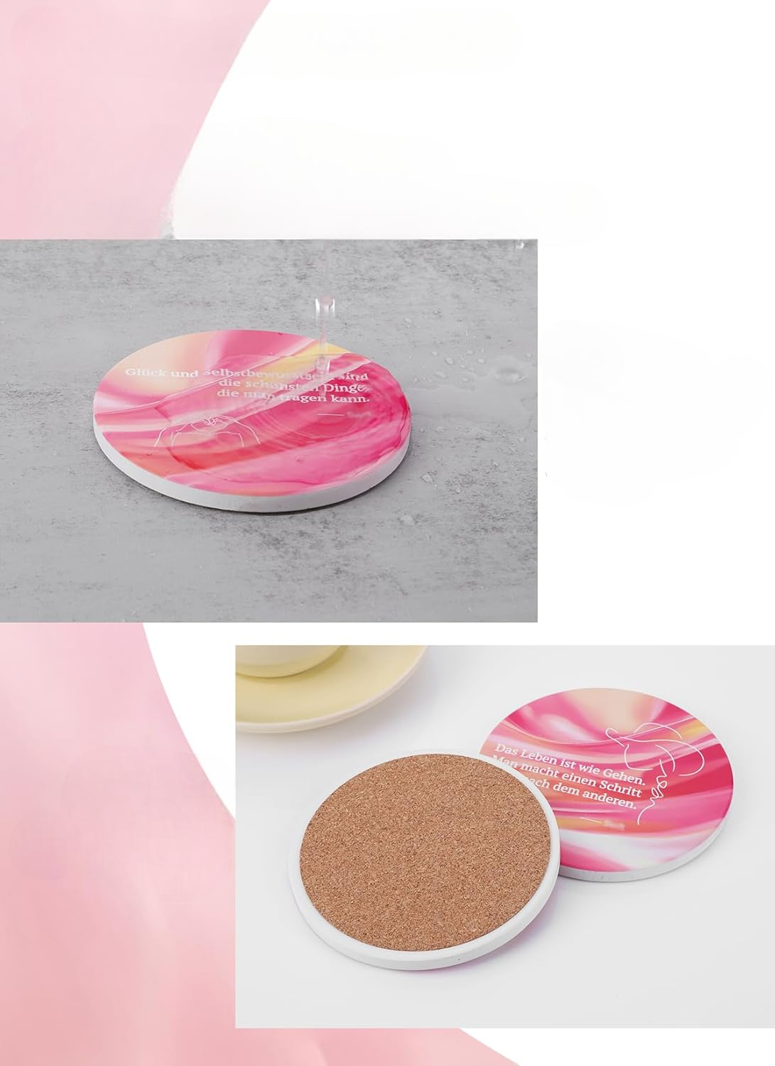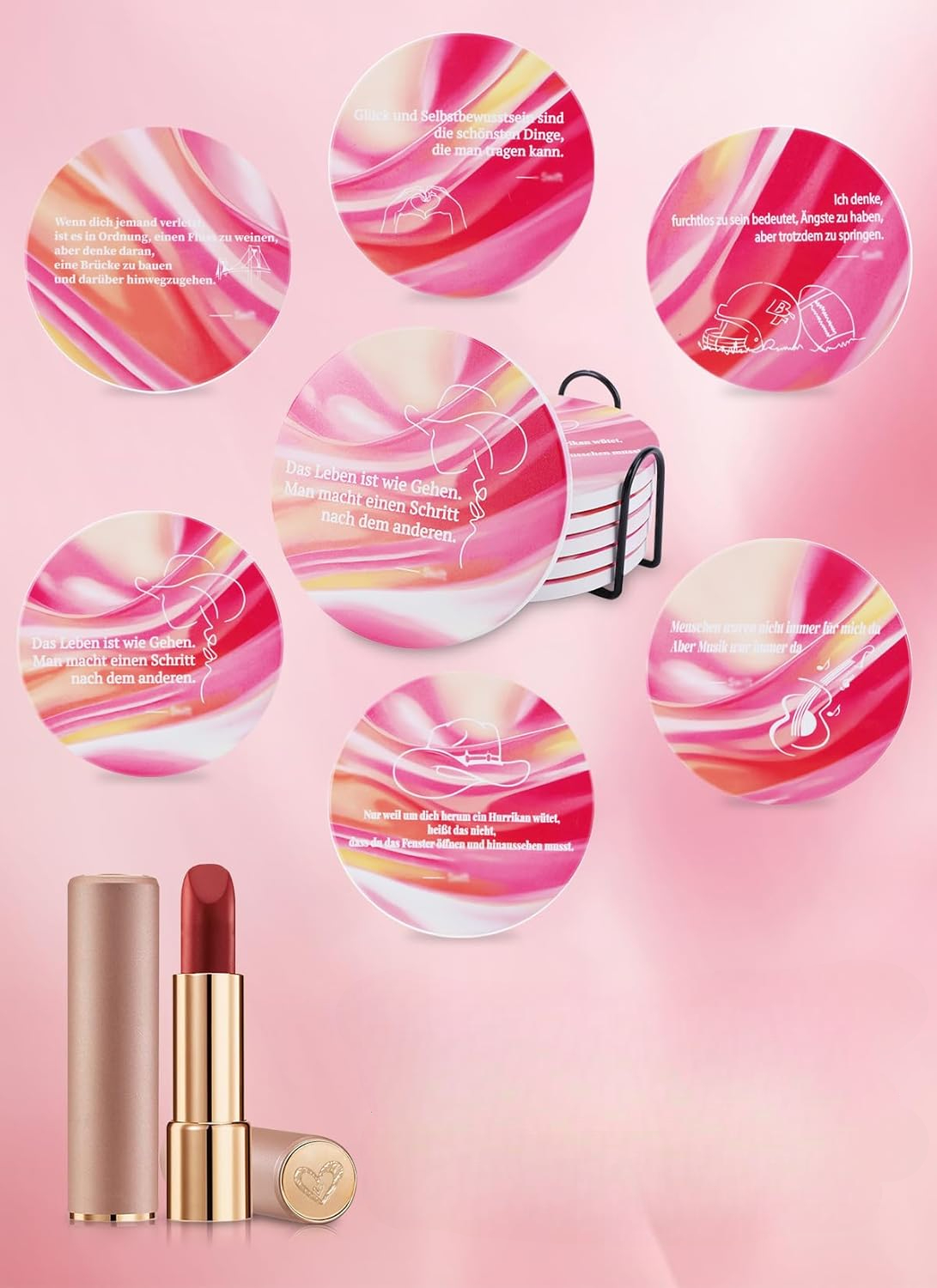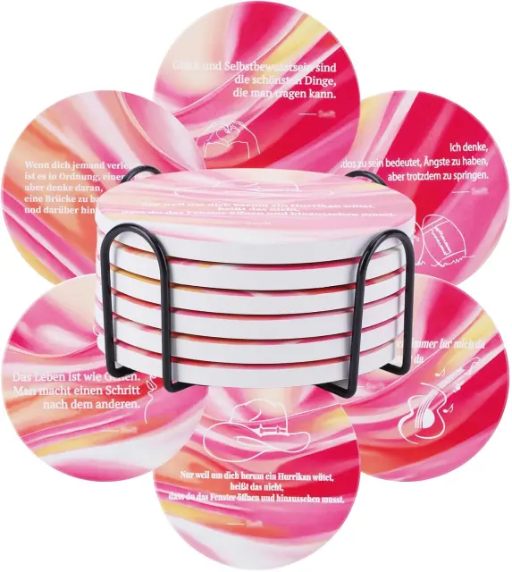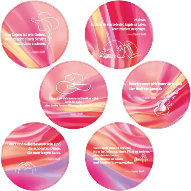 Komplet keramičnih podstavkov za skodelice z motivom Taylor Swift blagovne znamke BLOOOK je edinstven dodatek za vsak interier, ki bo navdušil ljubitelje elegantnih in funkcionalnih domačih dodatkov. Komplet vsebuje šest rožnatih podstavkov, od katerih je vsak okrašen z edinstvenim citatom Taylor Swift v nemščini, kar izdelkom podari oseben in navdihujoč značaj. Podstavki so izdelani iz visokokakovostne keramike, so trpežni, odporni na visoke temperature in zasnovani za enostavno čiščenje. Njihov premer 10,5 cm omogoča, da se popolnoma prilegajo različnim vrstam posode, od skodelic in kozarcev do steklenic ali majhnih vaz.