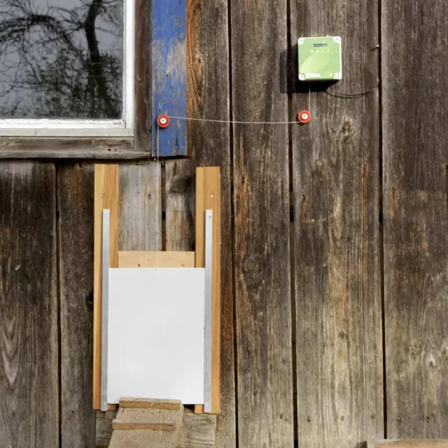 Komplet avtomatskih vrat za kokošnjak znamke Kerbl omogoča, da se lopute, vrata in drsna vrata kokošnjaka samodejno odpirajo in zapirajo.