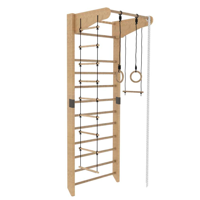 Lesena gimnastična lestev Kinder Sport je okolju prijazna rešitev za otroke in odrasle, ki se radi ukvarjajo s športom skozi vse leto. Vsak steber lestve je sestavljen iz dveh delov. Gimnastična lestev spodbuja motorični razvoj, to usklajevanje vadi vse dele mišic. Razširjena je z gimnastičnimi koleni, vrvjo in vrvno lestvijo. Gimnastična lestev je izdelana iz borovega lesa. Da bi se malček lahko ukvarjal s športom sproti in udobno, je bolje razmisliti o športnem kotičku na dosegu roke.