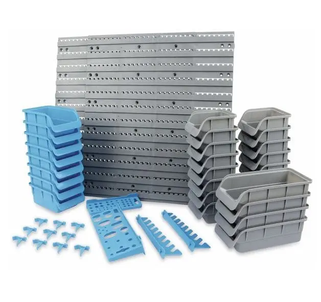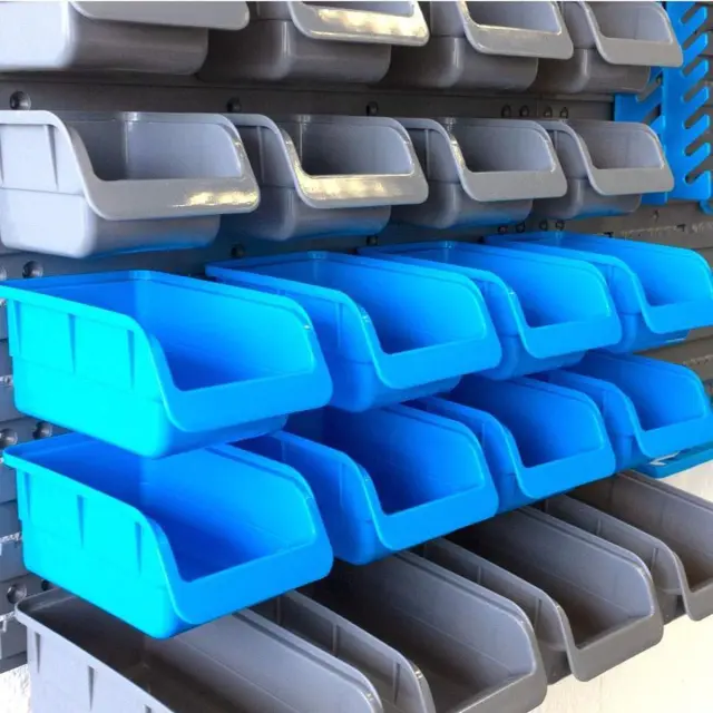Praktične škatle za zlaganje iz plastike, odporne na udarce, za shranjevanje majhnih delov, kot so vijaki, gumbi itd. Dobavljene z ustreznimi obešalnimi vodili.