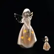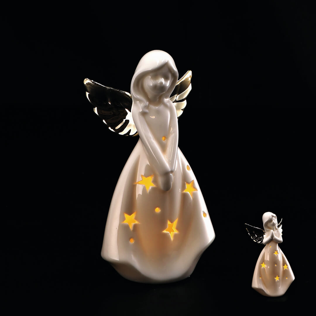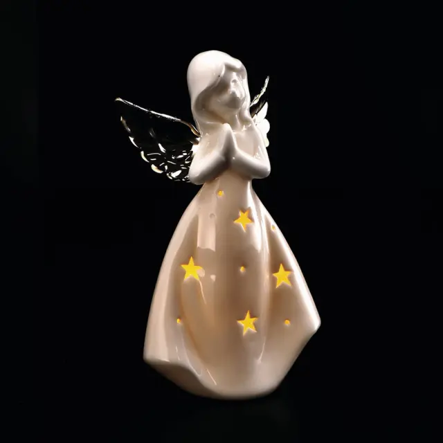Keramični kipec simpatičnega angelčka, višine 18,5 cm, je lahko edinstvena dekoracija v vašem domu. Angel z razprtimi krili simbolizira zaščito in upanje. LED lučka oddaja toplo belo svetlobo, kar daje kipcu prijeten in čarobni videz. Deluje na baterije (2LR44x1,5V), ki so priložene.