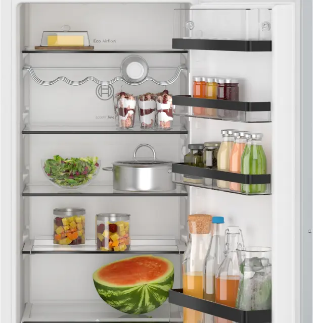 Neenakomerna temperatura v hladilniku lahko vpliva na okus in rok trajanja hrane.Eco Airflow skrbi za enakomerno razporeditev vlažnosti in temperature, tako da vaša živila ostanejo sveža dlje.