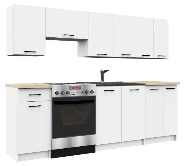 Idealna rešitev za majhno kuhinjo ali prizidek, kjer imamo na voljo le eno steno urejenega prostora, bo kuhinjska stenska enota. Kuhinjsko pohištvo Oliwia v brezčasni in univerzalni beli barvi bo zagotovo odlično delovalo v vsakem interierju - tako modernem kot tradicionalnem. Predlog obsega stojne in viseče omare ter delovno površino v modni, enostavni za čiščenje barvi, ki je sonomanska hrastovina. Celota je izdelana iz laminirane plošče debeline 16 milimetrov - materiala odpornega na poškodbe, trpežnega in robustnega, zaradi česar se pohištvo odlikuje po trdni konstrukciji.