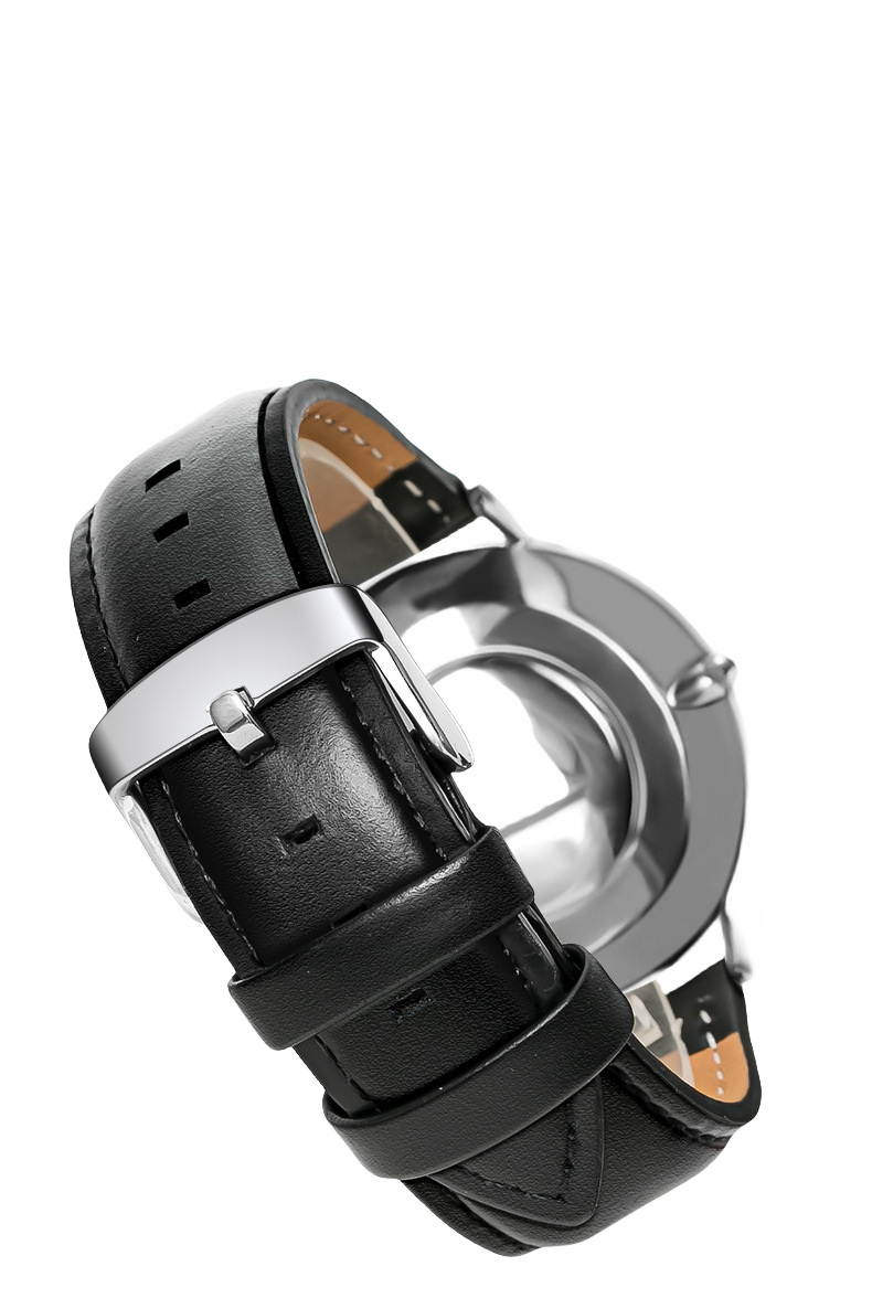 Vrhunsko usnje: Uživajte v razkošnem občutku visokokakovostnega govejega usnja, ki zagotavlja vzdržljivost in udobje. Klasična črna barva doda vaši uri DW prefinjen pridih.