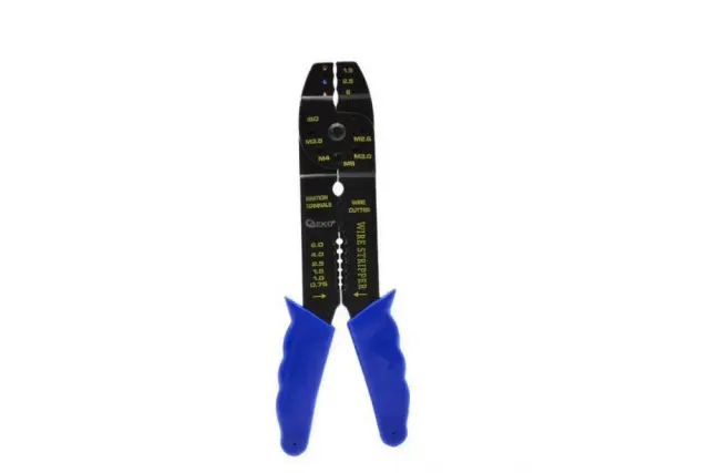 Orodje za stiskanje priključnih sponk. Ima izolacijski odstranjevalec, rezalnik žice in rezalnik vijakov. odstranjevanje izolacije iz žic: 0,5, 0,75, 1,25, 2,0, 3,0, 5,0 mm2 Rezalnik: M2.6, M3, M3.5, M4, M5 pritrdilni sponki v območju: 0,5 – 0,75 mm2 / 1,25 – 2,0 mm2 / 3,0 – 5,0 mm2
