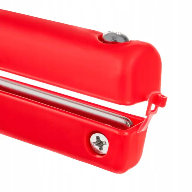 SPECIFIKACIJA – barva: srebrna / rdeča; nastavitev: razmik krakov in velikost sponke; material: plastika + pocinkano; mere: 23 x 16,5 x 4 cm; teža kompleta: 0,329 kg.