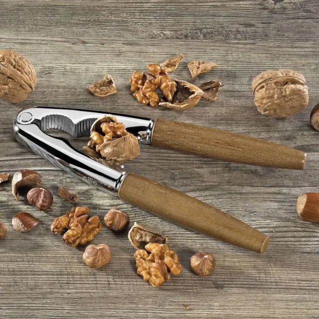 Klešče za trenje orehov Noci so izdelane iz nerjavečega jekla odpornega proti koroziji in iz lesenih ročajev, ki nudijo prijeten in naraven občutek v roki, medtem ko notranji grebeni zagotavljajo odličen oprijem za varno in učinkovito trenje orehov. Sistem z vzvodom omogoča, da za trenje oreščkov porabite minimalno silo, zato je idealen za dolgotrajno uporabo brez utrujenosti. Klešče so dovolj zmogljive, da se spopadejo tudi z najtršimi orehi, hkrati pa zagotavljajo udobno uporabo. Klešče so zanesljiv in eleganten pripomoček za vašo kuhinjo. Njihov ergonomski dizajn in vzdržljivost je nepogrešljiva za vse ljubitelje oreščkov.