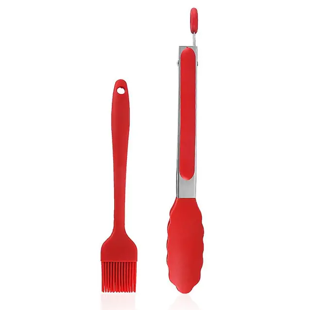 Klešče za žar Kuhinjske klešče iz nerjavečega jekla in 2-delna krtača iz silikona za hrano (rdeča)