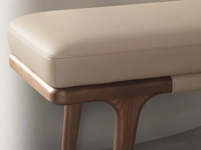 - Kombinacija oblazinjenja iz umetnega usnja z lesom nog v barvi oreha je popolna, da v vsak prostor vnese toplino in eleganco.