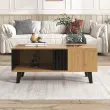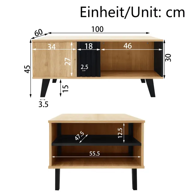Klubska mizica dimenzij 100x60x45 cm iz pisanega lesa in črne barve, s predali.
