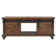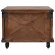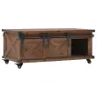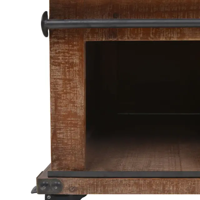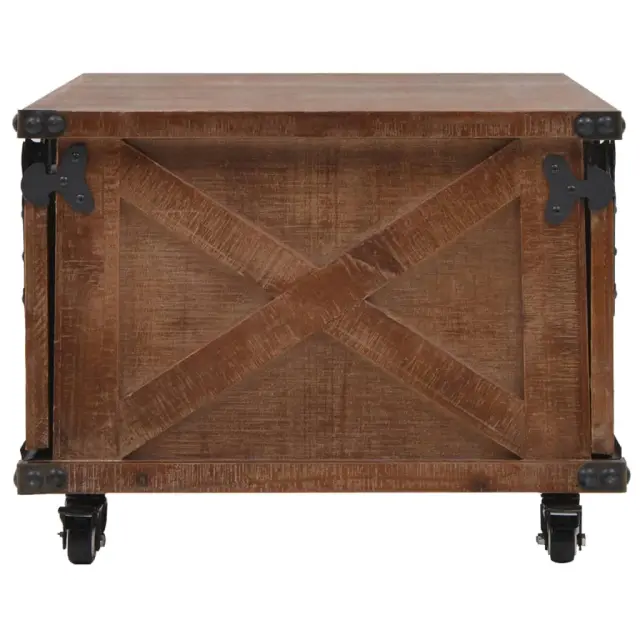 Ta klasična klubska mizica bo dekorativni dodatek k dekorju vaše dnevne sobe. Lahko se uporablja tudi kot stranska mizica, kavč mizica ali mizica za dnevno sobo. Ta zelo stabilna in vzdržljiva stranska mizica je narejena iz trdnega lesa jelke in izžareva starinski šarm, ki ji daje rustikalne značilnosti. Trdna površina je idealna za postavitev košar s sadjem, vaz ali drugih okrasnih predmetov. Klubska mizica ima veliko prostora za organizirano shranjevanje različnih vaših stvari. Edinstven dizajn z drsnimi vodili pripomore k enostavnemu odpiranju in zapiranju vrat ter prispeva k starinskemu in industrijskemu stilu mizice. Ima štiri fleksibilna kolesca za premikanje po hiši. Ta klubska mizica je preprosta za sestavo.Barva: RjavaMaterial: Trden les jelke + MDF (mediapan) + jekloDimenzije: 91 x 51 x 38 cm (D x Š x V)Velikost vrat: 29 x 21,5 cm (D x Š)Premer kolesa: 4 cmBrušeno in barvanoS 3 predelkiS 4 kolesci