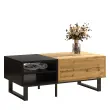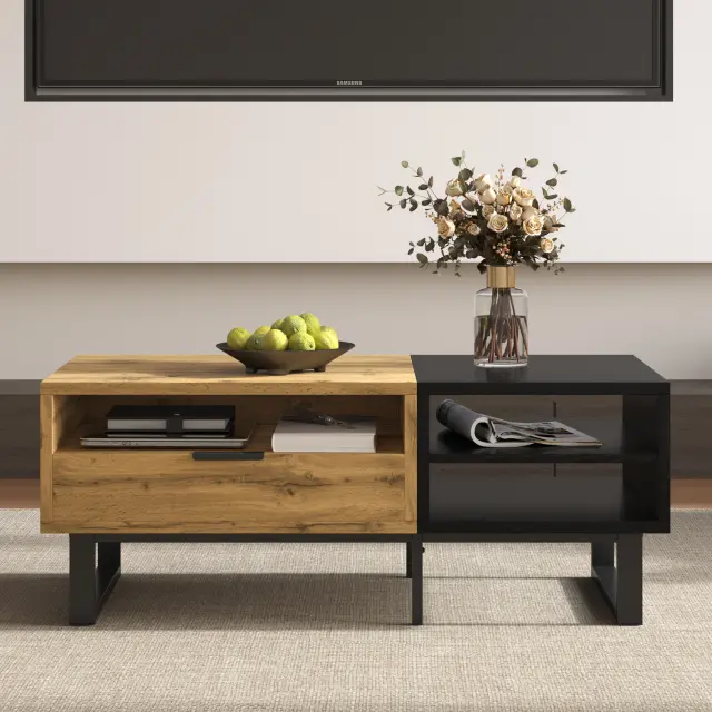 Klubska mizica z barvno blokovno strukturo, predelki, predali in kovinskimi nogami.