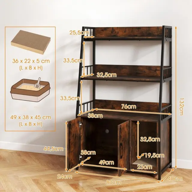Vsestranska omarica za mačke: zaprto pohištvo za stranišče ponuja veliko površine in 2 polici, ki zagotavljata odlično organizacijo za hišne pripomočke, okraske in celo knjige ali igrače. Večnamenska zasnova omogoča, da deluje kot omarica za shranjevanje ali kotna knjižna polica, s čimer učinkovito prihrani prostor.