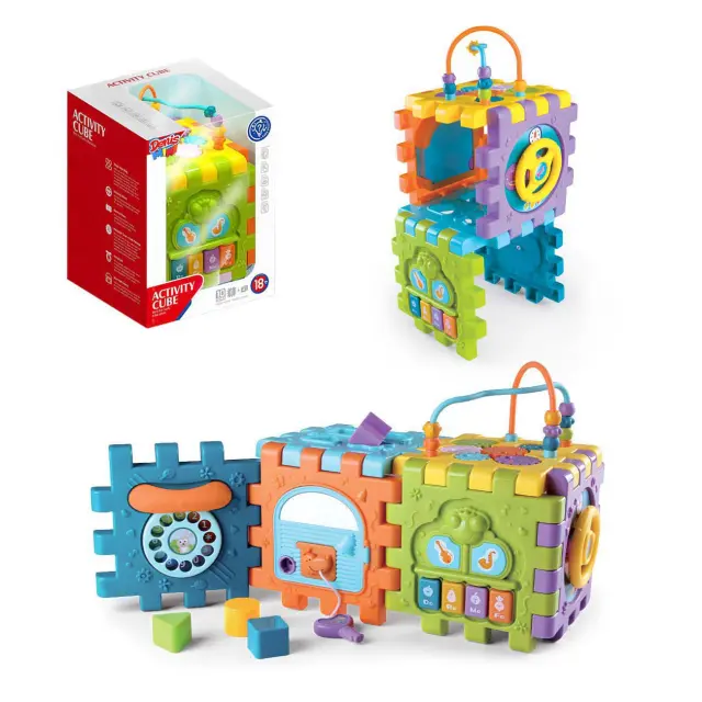 Ta didaktična sestavljanka je popolna igrača za vašega otroka, saj poleg zabave omogoča tudi pravilen razvoj skozi igro. Stimulativne značilnosti, geometrijske oblike in različne barve spodbujajo malčka k razmišljanju, kombiniranju, zaznavanju prostora in osredotočanju. To je najboljši način učenja, saj se učimo skozi igro in novo znanje pridobivamo z igranjem. Otrok lahko preureja kocko, kar jo naredi še bolj zanimivo in spodbudno za samostojno igro. Tip: Prve izobraževalne igrače za dojenčke. Set vključuje: 10x elementov, 6x plošč, 4x oblike. V setu: 1x elektronska igračka kocka. Izzivi: sortiranje geometrijskih oblik, vodilo, vrata s ključem, ogledalo, klavir s melodijami, vrtljiva kolesa, telefon s tipkovnico in zvočnim učinkom, volan z zvočnim učinkom, itd. Značilnost: Kocko je mogoče razstaviti in preurediti v različne tvorbe po želji. Potrebne baterije za učinke: 3x AAA 1.5V, niso priložene. Material: trdna ABS plastika, varna, netoksična. Starost: od 18 mesecev naprej.