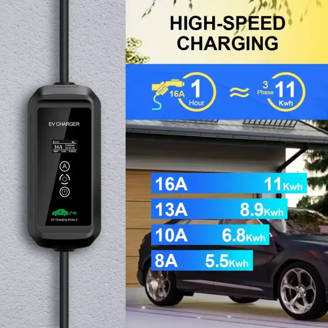 • Vsestranske možnosti polnjenja: Kolanky Type 2 prenosni EV polnilec ima nastavitve prilagodljivega toka (6A do 16A), ki ustrezajo različnim specifikacijam električnih vozil, kar zagotavlja učinkovito polnjenje za različne modele avtomobilov.