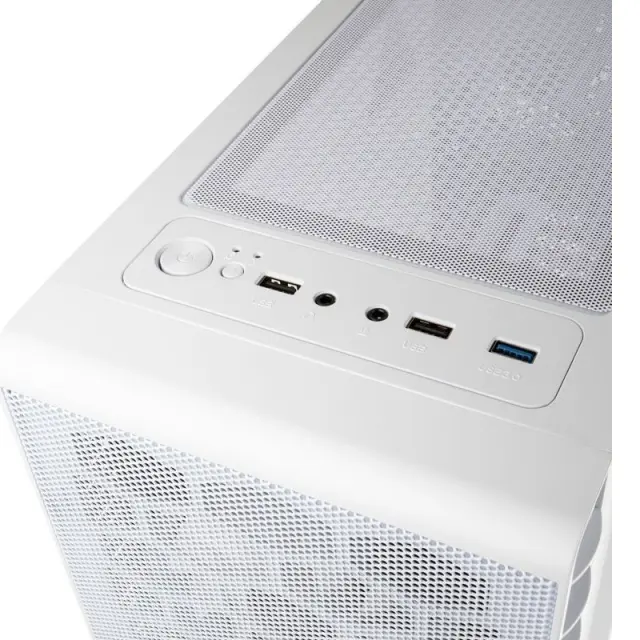 Kolink Observatory Lite Mesh ARGB Matte White Mid-Tower ohišje, nameščeno na sprednji strani zgornje plošče, ima popolnoma opremljeno V/I ploščo. To vključuje dva priključka USB 2.0 in enega USB 3.0, priključek za avdio vhod in izhod ter stikalo RGB/Reset.