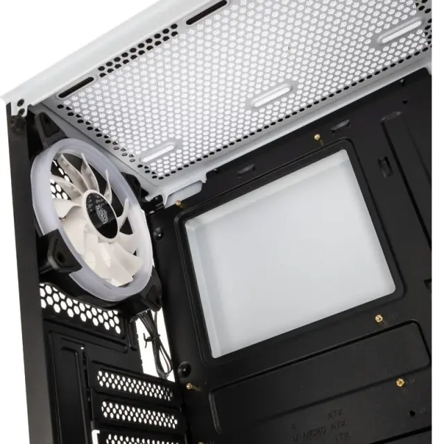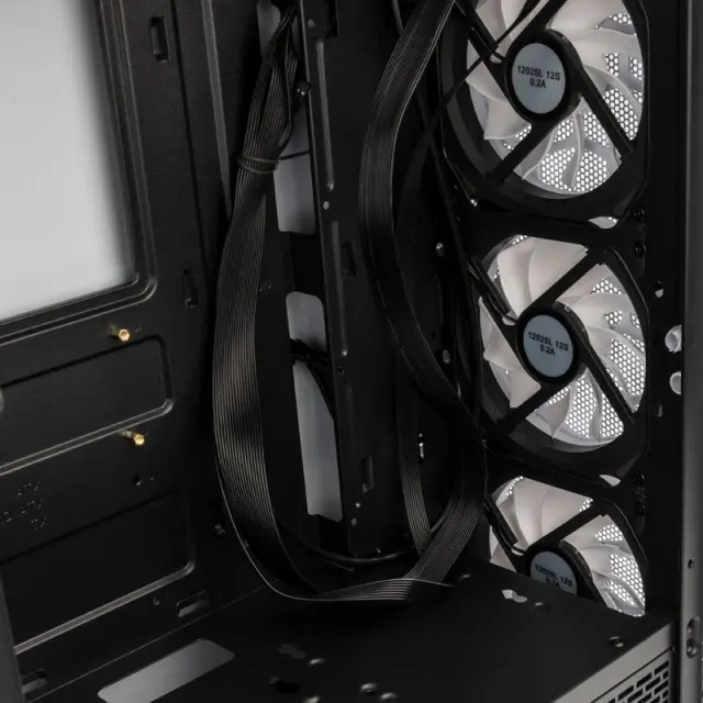 Za povečanje naravnega zračnega toka iz mrežaste obloge ima Kolink Observatory Lite Mesh ARGB Matte White štiri vnaprej nameščene ventilatorje. Vsak s premerom 120 mm, trije so nameščeni na sprednji strani, zadnji ventilator pa je nameščen na zadnji plošči. Te ventilatorje, opremljene z živimi RGB LED diodami, je mogoče prilagoditi hitrost zahvaljujoč priloženemu ventilatorskemu pestu in RGB daljinskemu upravljalniku – ki prav tako nadzoruje svetlobne učinke. Druga možnost je, da lahko te ventilatorje povežete z matično ploščo in jih upravljate prek nje.