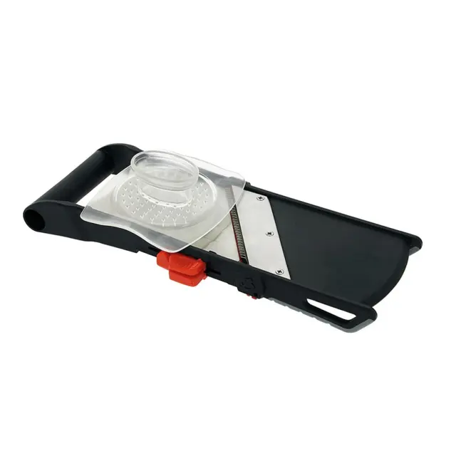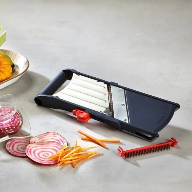 DE BUYER rezalnik KOMI je natančen in učinkovit kuharski pripomoček, ki z izredno ostrim rezilom pod kotom 35° nareže zelenjavo na poljubne rezine – omogoča namreč hitro in enostavno prilagajanje debeline (od 0 do 5 mm), s priloženimi nastavki pa lahko zelenjavno narežete na 2 in 4 mm trakce (julienne). Rezalnik je opremljen z ergonomskim ščitnikom, ki omogoča varno uporabo rezalnika in vaše roke zaščiti pred ostrim rezilom. Francoski proizvajalec De Buyer je vodilni na področju proizvodnje visokokakovostne kuhinjske posode, kuhinjskih nožev in ostalih kuhinjskih pripomočkov že od leta 1830.