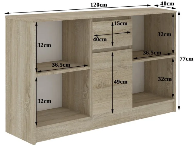 Dimenzije pohištva so 120 cm x 77 cm x 40 cm. Spodbujamo vse, ki iščejo privlačno vizualno, dobro kakovost, a tudi stroškovno učinkovito možnost za svoj opremljen prostor, da se bolje spoznajo s to zanimivo ponudbo. Upamo, da bo izpolnila pričakovanja tudi najzahtevnejših posameznikov. Komoda se sestoji iz dveh odprtih polic, ene za vrati in enega predala. Vse skupaj se lepo predstavi samo, kot tudi v kombinaciji z drugim pohištvom iz te serije. Vabimo vas k nakupu.