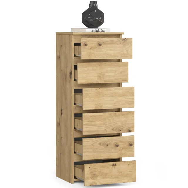 Komode so priljubljena vrsta pohištva, ki se postavi ob posteljo. Na vrhu je običajno svetilka, medtem ko so znotraj predmeti, ki olajšajo počitek in spanje. Ljudje, ki iščejo elegantno komodo, naj pozorno pogledajo komodo CL6 40 cm v barvi umetniškega hrasta. Lepo bo izgledala v vsaki spalnici. Lahko jo postavite tudi v otroško sobo.