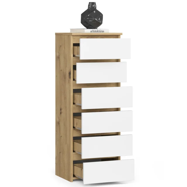 Komode so priljubljena vrsta pohištva, ki se postavi ob posteljo. Na vrhu je običajno svetilka, medtem ko so znotraj predmeti, ki olajšajo počitek in spanje. Ljudje, ki iščejo elegantno komodo, naj pozorno pogledajo komodo CL6 40 cm v barvi umetniškega hrasta z belimi frontami. Lepo bo izgledala v vsaki spalnici. Lahko jo postavite tudi v otroško sobo.