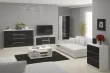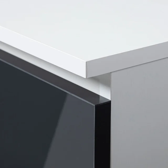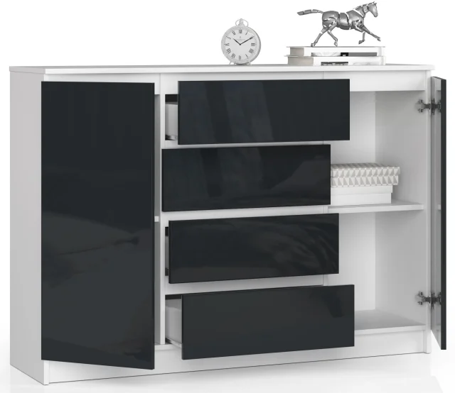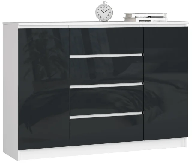 Dvobarvna K 140 komoda z 2 omaricami in 4 predali je izdelana iz MDF plošče z akrilnim premazom (proizvajalec Kronospan). Telo pohištva je ohranjeno v beli barvi, medtem ko so sprednje strani omaric in predalov izdelane iz kontrastne visokosijajne plošče v grafitni barvi. Komoda je simetrično zasnovana. Njena osrednja del je sestavljena iz vrste 4 predalov, medtem ko sta leva in desna stran omarici z enim vratom, ki se odpirajo navzven iz pohištva. Predali se izvlečejo zahvaljujoč kovinskim valjčnim vodilom in zagotavljajo priročno shranjevanje zaradi obsežnega prostora. Vsaka od omaric komode je opremljena z 2 policama.