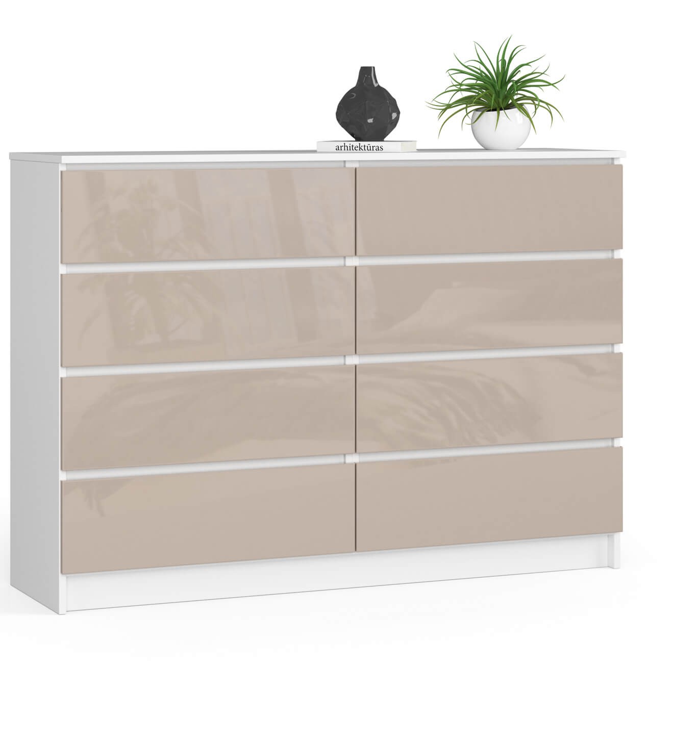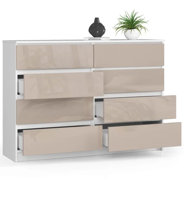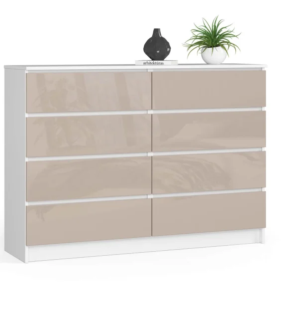 Velika bela / kapučino sijajna omara je odlična izbira za prostore, urejene v različnih stilih. Takšen kos pohištva se bo odlično prilegal modernim, rustikalnim, skandinavskim ali glamur stilom. Prav tako bo dobro deloval v manjših prostorih, saj bo sijaj pohištva vizualno povečal prostor.
