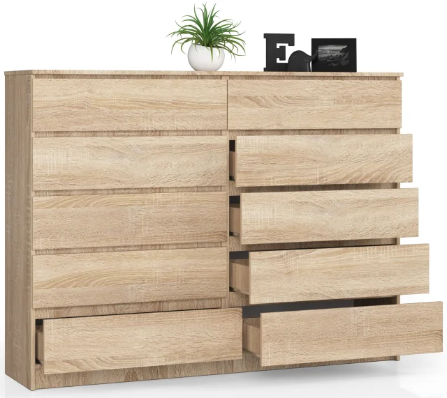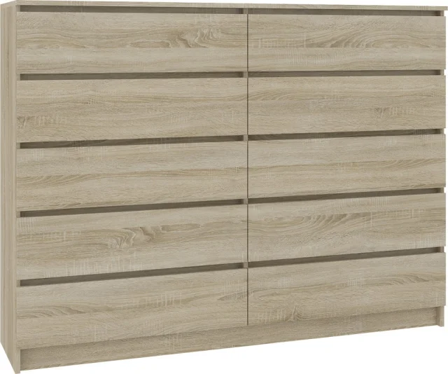 K60 komoda v barvi sonoma hrasta je idealen predlog, namenjen vsem strankam naše spletne trgovine, ki jih zanima nakup velikega kosa pohištva, namenjenega shranjevanju različnih vrst predmetov, potrebnih v določeni sobi. Predstavljena komoda, ki jo odlikuje univerzalen, brezčasni dizajn in odlična kakovost, je opremljena kar z desetimi predali. Enostavna za vsakodnevno uporabo in tudi enostavna za čiščenje, ta predlog bo zagotovo zadovoljil stranke, ki iščejo moderne, preproste, a hkrati elegantne rešitve. Komoda bo našla uporabo v dnevnih sobah ali spalnicah, pa tudi v hotelskih sobah ali pisarniških prostorih. Konkurenca cena tega trdno izdelanega izdelka je prav tako vredna omembe.