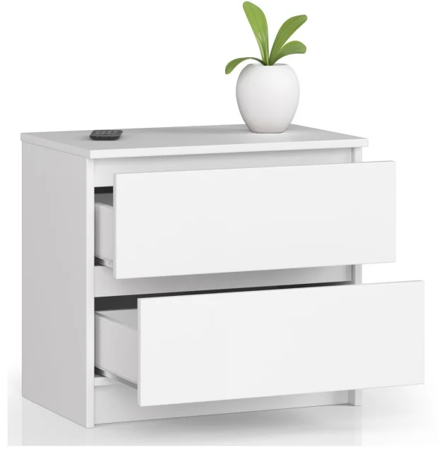 Bela nočna omarica je visokokakovosten izdelek, ki bo odlično deloval tako v modernih kot tudi v tradicionalno urejenih prostorih. Pohištvo je skrbno izdelano iz trdne laminirane plošče debeline šestnajst milimetrov, ki je odporna na obrabo. Njegovi robovi so pokriti z ABS robom. Preprosta oblika in minimalističen značaj prispevata k univerzalnosti in brezčasnosti ponudbe, ki je na voljo v naši trgovini po zelo privlačni ceni. Prostorne predale premikajo kovinski valjčni vodniki, kar olajša uporabo nočne omarice. Pohištvo je namenjeno samostojni sestavi in bo zagotovo izpolnilo pričakovanja tistih, ki jih zanimajo trdno izdelane, impresivne nočne omarice, primerne za vsako spalnico - ne glede na njen stil ali velikost.