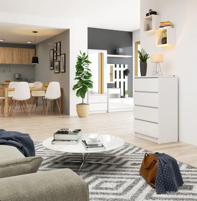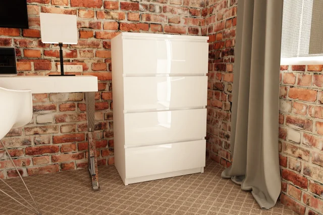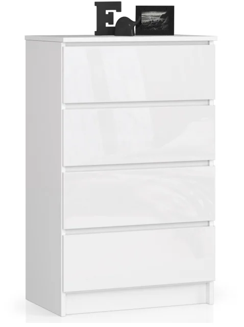 K 60 cm bela komoda je preprosta, a hkrati elegantna kos pohištva, ki izstopa s svojim brezčasnim značajem. Njena univerzalna zasnova omogoča uporabo v katerem koli izbranem prostoru - dnevna soba, mladinska soba, otroška soba, spalnica, jedilnica, hodnik ali pisarniška notranjost. Omara je opremljena s štirimi prostornimi predali, ki se enostavno odpirajo in zapirajo. Bele, visokosijajne akrilne fronte cenijo kupci, ki cenijo tako vizualne lastnosti izbranih izdelkov kot njihovo visoko kakovost.