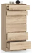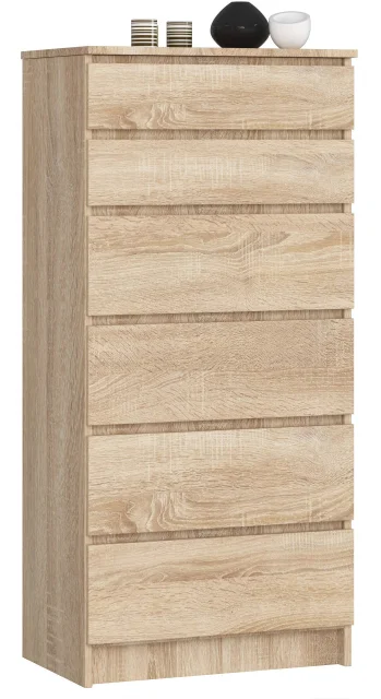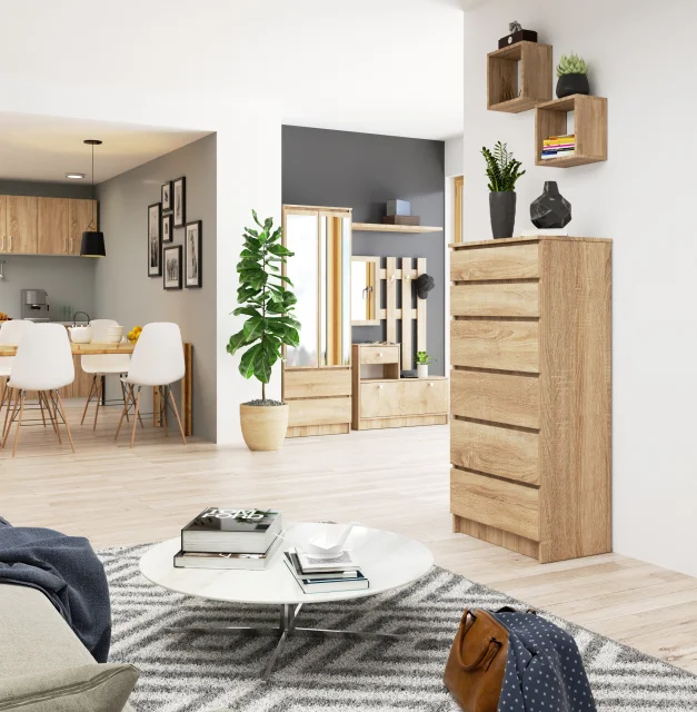 Brezzložni sprednji deli poudarjajo duh minimalizma, v katerem je bila komoda izdelana. Uporaba pohištvene plošče v vzorcu Sonoma hrasta s debelino 16 mm, obdelane z ABS furnirjem v istem slogu, ne zagotavlja le trajnosti in zaščite pred prodiranjem vlage, temveč ji daje tudi zelo sodoben značaj. Kot rezultat, se ta komoda popolnoma prilega modernim in dobro osvetljenim prostorom. Skupaj z drugim pohištvom, ki uporablja umirjene barve in preprostost izvedbe, se bo dobro obnesla v notranjostih, urejenih v skandinavskem slogu, pa tudi v otroških ali mladinskih sobah.