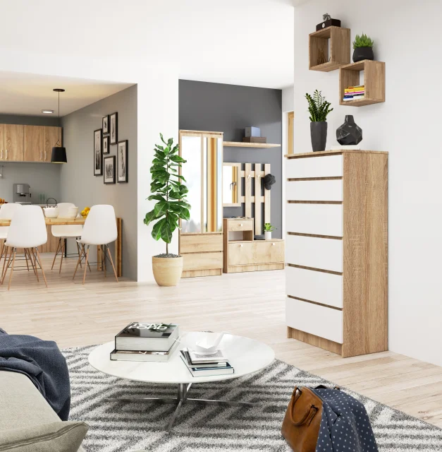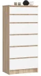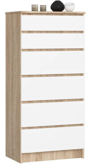 6 prostornimi predali, stabilno konstrukcijo in brezčasnim videzom - to je komoda K60! Ima privlačno kombinacijo telesa v elegantni sonomanski hrastovi barvi in predali z univerzalnimi belimi sprednjimi stranmi. Njegova preprosta, a udarna zasnova ne bo le odlično izgledala v spalnici, hodniku, pisarni ali dnevni sobi - enostavno jo je tudi kombinirati z drugimi elementi dekorja prostora. V asortimanu naše spletne trgovine z pohištvom Akord boste našli ujemajoče pohištvo iz iste kolekcije kot komoda K60.