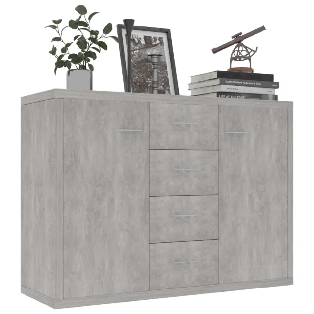 Ta komoda ima 4 predale in 2 vrata, zato zagotavlja veliko prostora za knjige, večpredstavnostne naprave in druge stvari. Na njeno trdno površino lahko postavite dekorativne stvari, foto okvirje ali rože. Lahko se uporablja tudi kot nizka omarica, stranska omarica itd. Zahvaljujoč vrhunskemu materialu plošče je ta kredenca narejena za dolgotrajno uporabo.