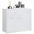 Ta komoda iz kakovostne plošče je izjemno vzdržljiva in trdna. Z 1 velikim predalom in 3 vrati nudi dovolj prostora za shranjevanje vaših knjig, večpredstavnostnih naprav in ostalih stvari. Trdna površina mize je idealna za razstavljanje okrasnih predmetov, foto okvirjev ali lončnic.