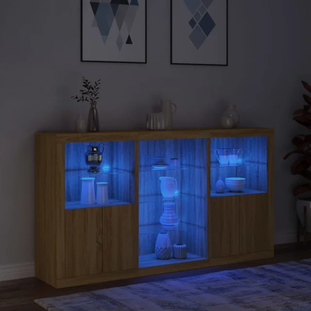 • RGB LED luči: Bife omarica je opremljena z živahnimi RGB LED lučkami. Z različnimi prilagodljivimi meniji lahko brez težav spreminjate barvo luči in celo nastavite njihovo samodejno prilagajanje. Te LED lučke ne le poudarjajo sodoben videz komode, temveč tudi povečujejo njeno modno privlačnost.