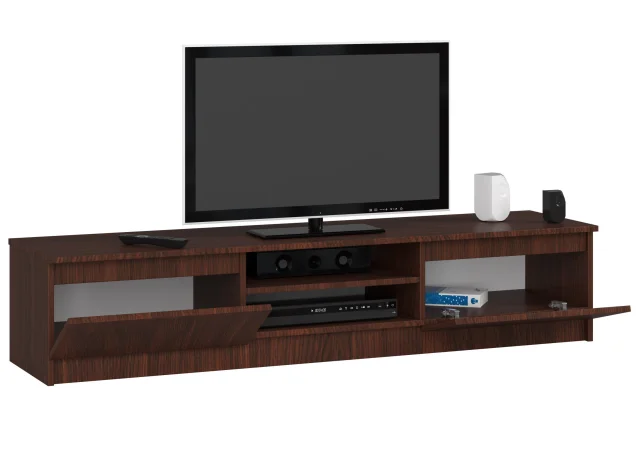 Kabinet RTV v barvi Wenge ima dve polici, kjer lahko uspešno uredite elegantne dodatke, naprave, pa tudi naprave, kot so dekoder ali konzola in DVD predvajalnik. Vendar to še ni vse; na obeh koncih TV mize so vrata, ki vodijo do prostornatih omar, ki lahko vsebujejo precejšnjo količino dokumentov in dodatkov. Predstavljeni model je dolg 160 centimetrov, tako da lahko sprejme televizorje večjih dimenzij. Poleg tega je njegova višina le 33 centimetrov, kar omogoča sprostitev pred televizorjem, postavljenim pod pravim kotom! Vredno je dodati, da je globina omare 40 centimetrov.
