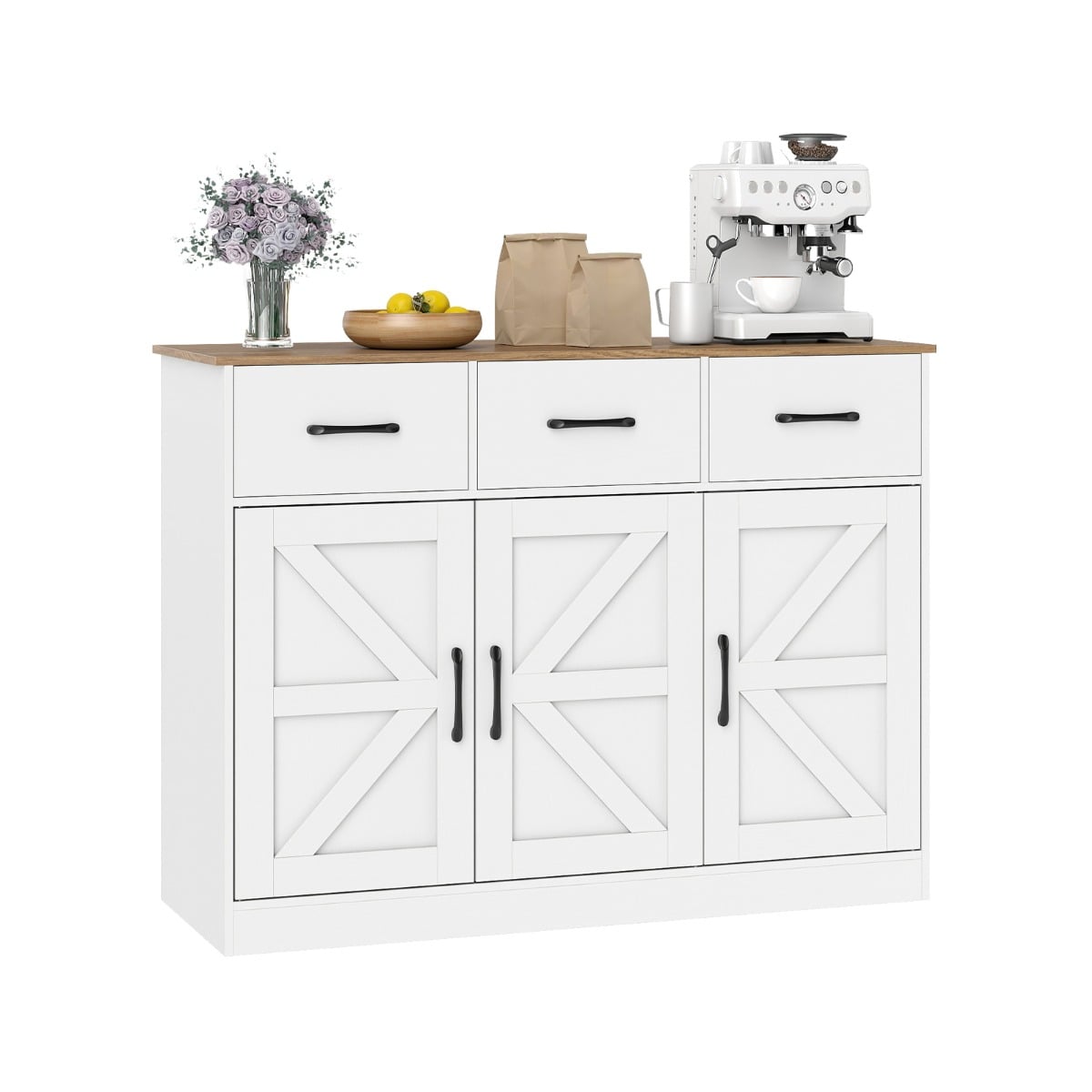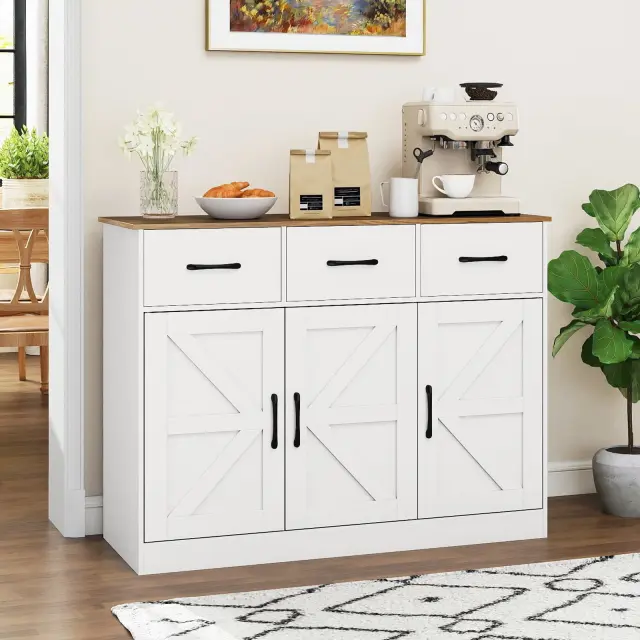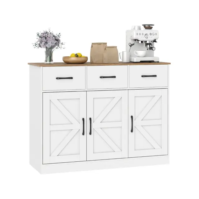 S široko delovno površino, 3 praktičnimi predali in 2 zaprtima omarama ponuja ta bife omara odlično vsestranskost za shranjevanje v vašem domu. Njena funkcionalna zasnova poskrbi za urejenost stvari in preprečuje nered.