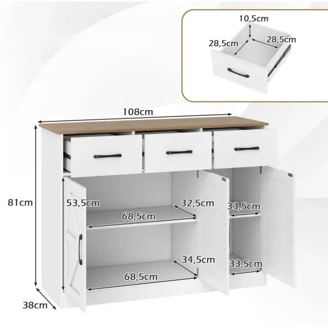 Ta kmečka kredenca združuje čar in praktičnost ter ponuja veliko prostora za shranjevanje s 3 uporabnimi predali, 2 velikima omarama in široko površino, ki je idealna za razstavljanje ali serviranje. V notranjosti sta 2 nastavljivi in odstranljivi polici, ki omogočata prilagodljivo in prilagodljivo shranjevanje različnih jedilnih pripomočkov. Varnost je prednostna naloga: kuhinjska bife omara ima ojačano dno, 2 varnostni napravi proti prevrnitvi in zaščitne nogice. Njena brezčasna zasnova ji doda toplino in značaj, zaradi česar bo v vsakem prostoru pritegnila pozornost. Naj bo dodaten prostor za shranjevanje v jedilnici, dekorativni poudarek v dnevni sobi ali funkcionalni organizator v predprostoru - ta vsestranska omarica se bo brez težav prilagodila slogu in zahtevam vašega doma.