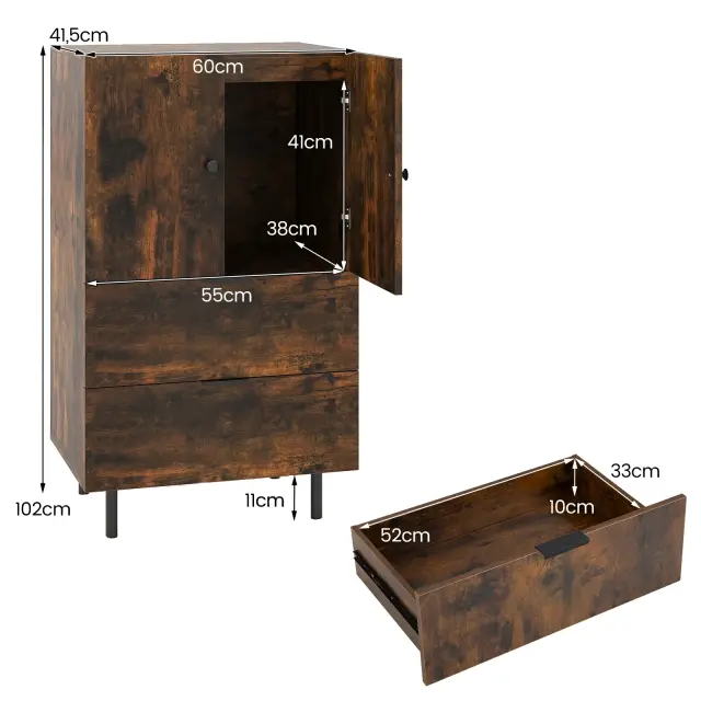 Vsestranski prostor za shranjevanje: ta kredenca ima veliko omaro z dvema vratoma in dva predala, ki sta idealna za shranjevanje posode ali kuhinjskih pripomočkov. Poleg tega široka mizna plošča omogoča enostaven dostop do kavnega aparata, mikrovalovne pečice, friteze z vročim zrakom ali dekorativnih predmetov.