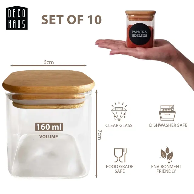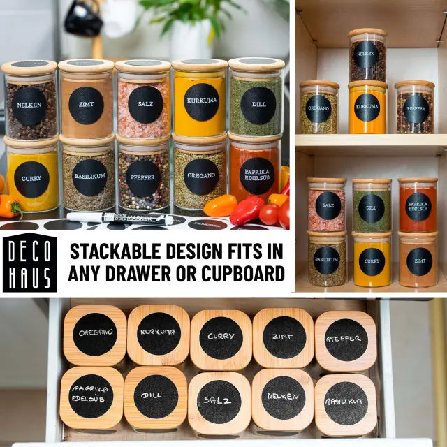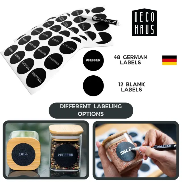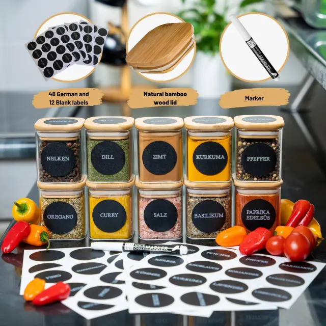 Poleg steklenih kozarcev boste prejeli tudi 48 nalepk v nemškem jezikom in 12 praznih nalepk, ki jih lahko uporabite za označevanje posod za shranjevanje, vrat omaric ali stojal za začimbe s priloženim krednim pisalom. Nalepke lahko kadar koli pobrišete in nanje ponovno pišete.