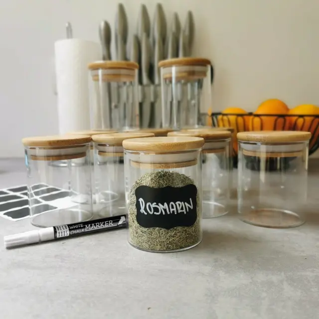 Poleg steklenih kozarcev boste prejeli tudi 16 praktičnih samolepilnih nalepk, ki jih lahko uporabite za označevanje posod za shranjevanje, vrat omaric ali stojal za začimbe s priloženim krednim pisalom. Nalepke lahko kadar koli pobrišete in nanje ponovno pišete.