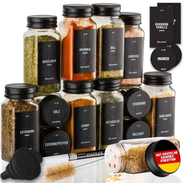 Ne dobite le 12 odličnih kozarčkov za začimbe, ampak celoten komplet, v katerem boste našli vse, kar potrebujete. Vključenih je 48 prednatisnjenih okroglih nalepk z imeni začimb v nemščini, 48 prednatisnjenih pravokotnih nalepk z imeni začimb v nemščini, 24 praznih okroglih nalepk in 22 praznih pravokotnih nalepk na katere lahko pišete s priloženim visokokakovostnim krednim pisalom.