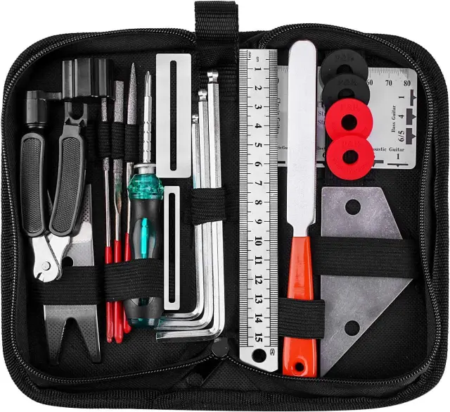 Komplet za popolno popravilo: Ta obsežen komplet 20 orodij vključuje vse, kar potrebujete za osnovno vzdrževanje in popravila vaše kitare, od nastavitve akcije strun do privijanja ohlapnih vijakov.