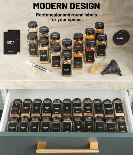 Ne dobite le 24 odličnih kozarčkov za začimbe, ampak celoten komplet, v katerem boste našli vse, kar potrebujete. Vključenih je 100 prednatisnjenih okroglih nalepk z imeni začimb v nemščini, 100 prednatisnjenih pravokotnih nalepk z imeni začimb v nemščini, 40 praznih okroglih nalepk in 40 praznih pravokotnih nalepk na katere lahko pišete s priloženim visokokakovostnim krednim pisalom.